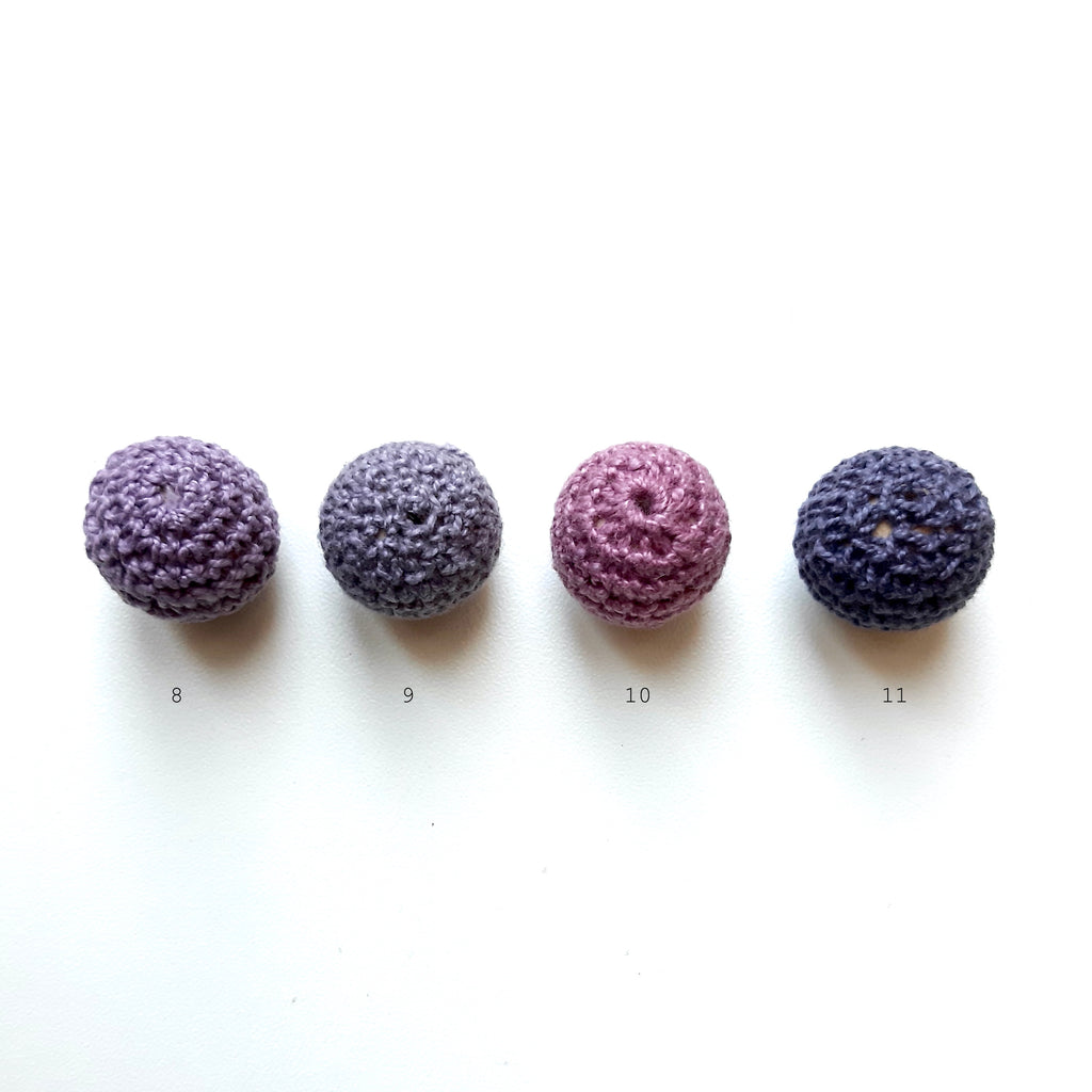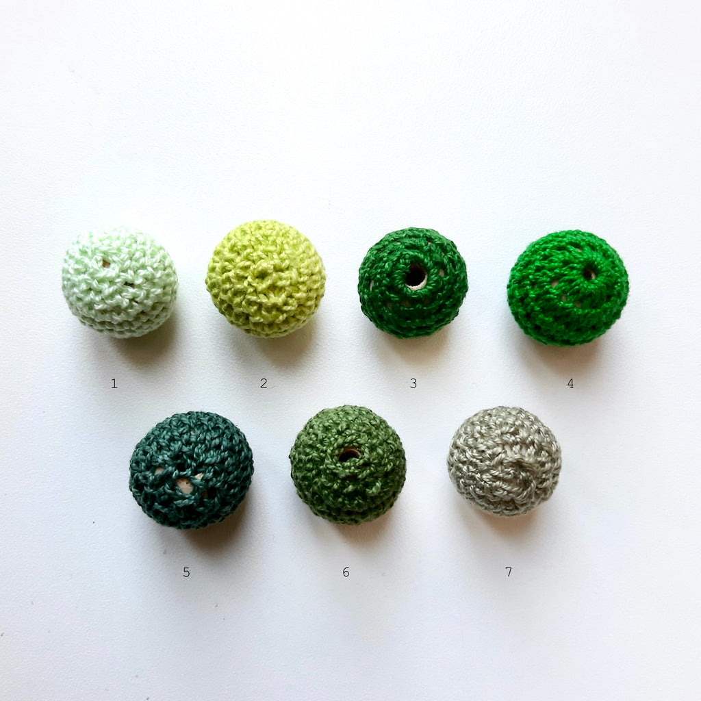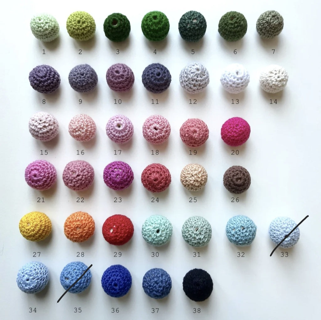 Houten kralen van 24mm met een omhaakt “jasje”.