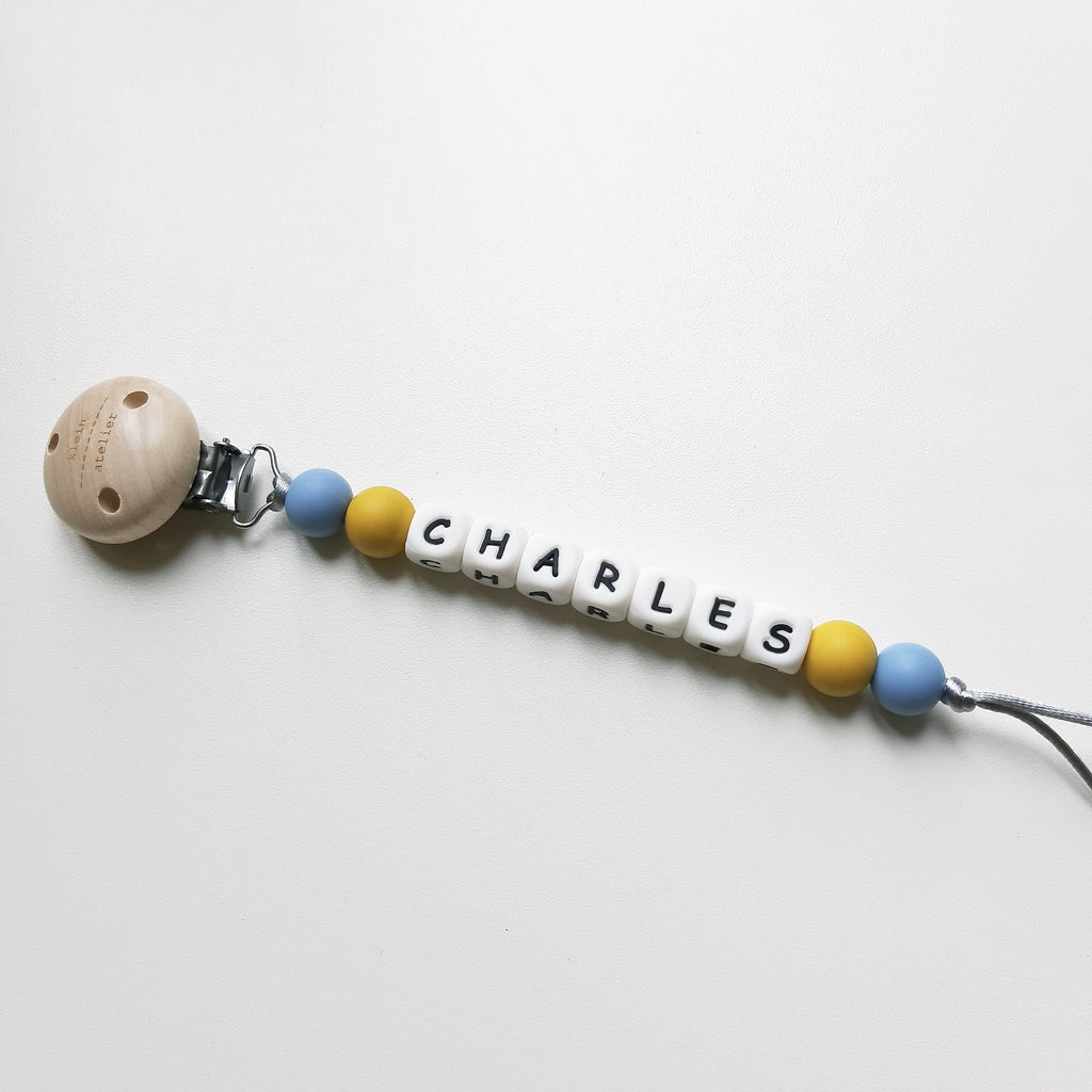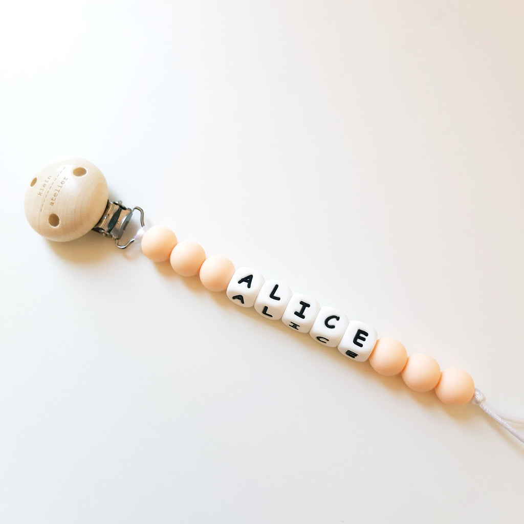 Deze fopspeenketting is speciaal ontworpen om te kunnen personaliseren. Je kan namen opgeven tot maximaal 10 karakters.