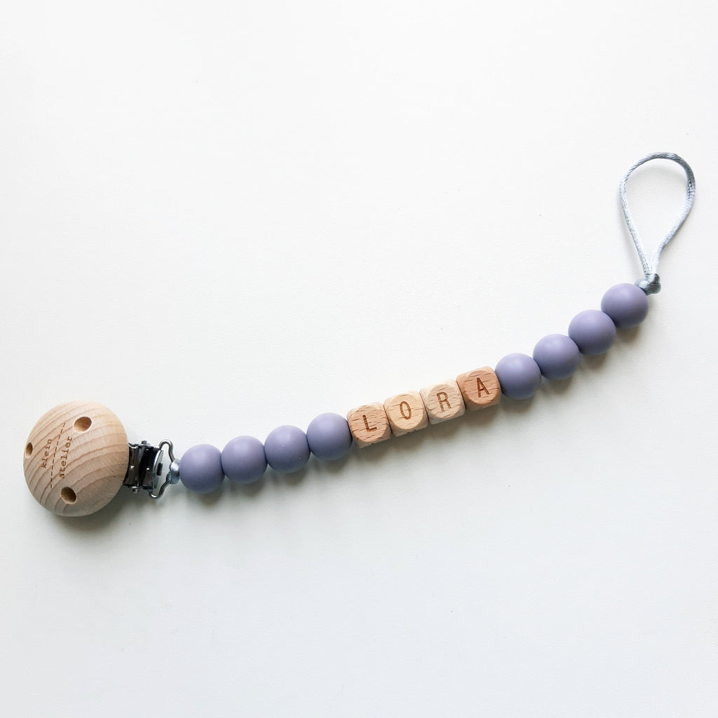 Je kan zelf de primaire kleuren kiezen uit onze uitgebreide kleurkaart én een naam. Je kan kiezen tussen silicone of houten letters. Een ideale fopspeenketting om cadeau te doen bij een geboorte!
