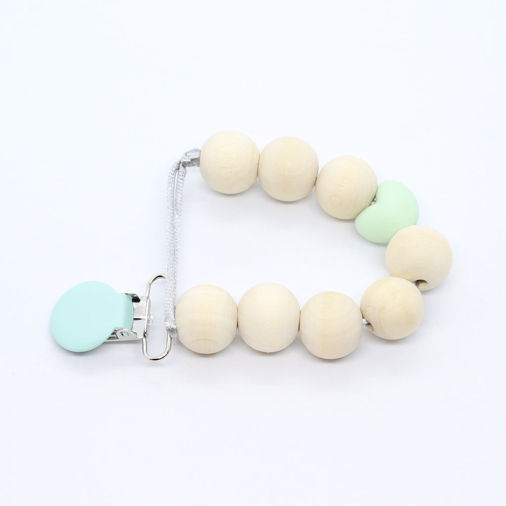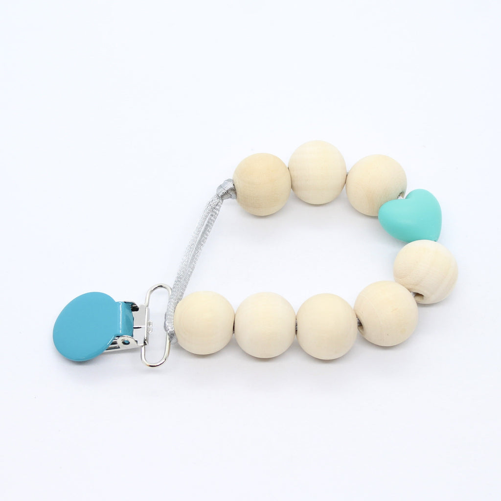 Een volledig houten fopspeenketting met één silicone hartje als accent.