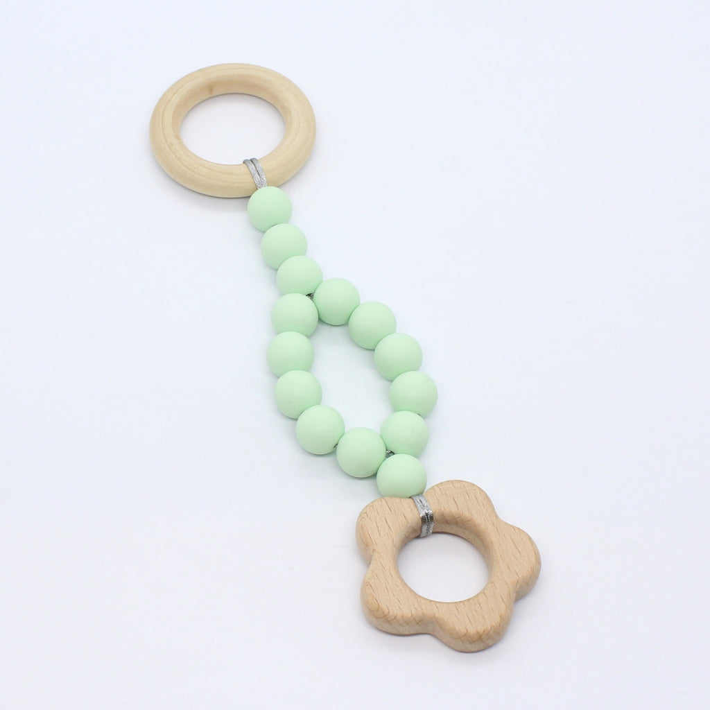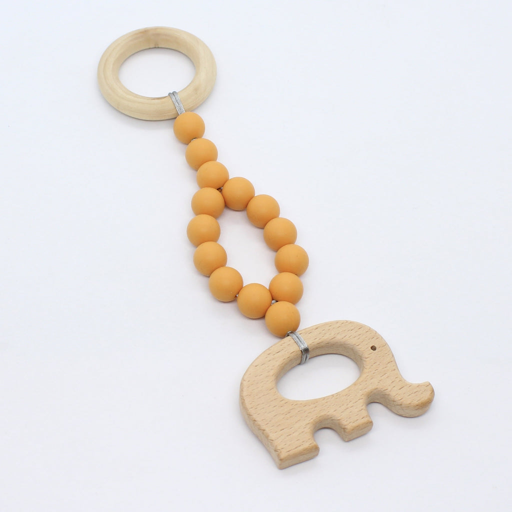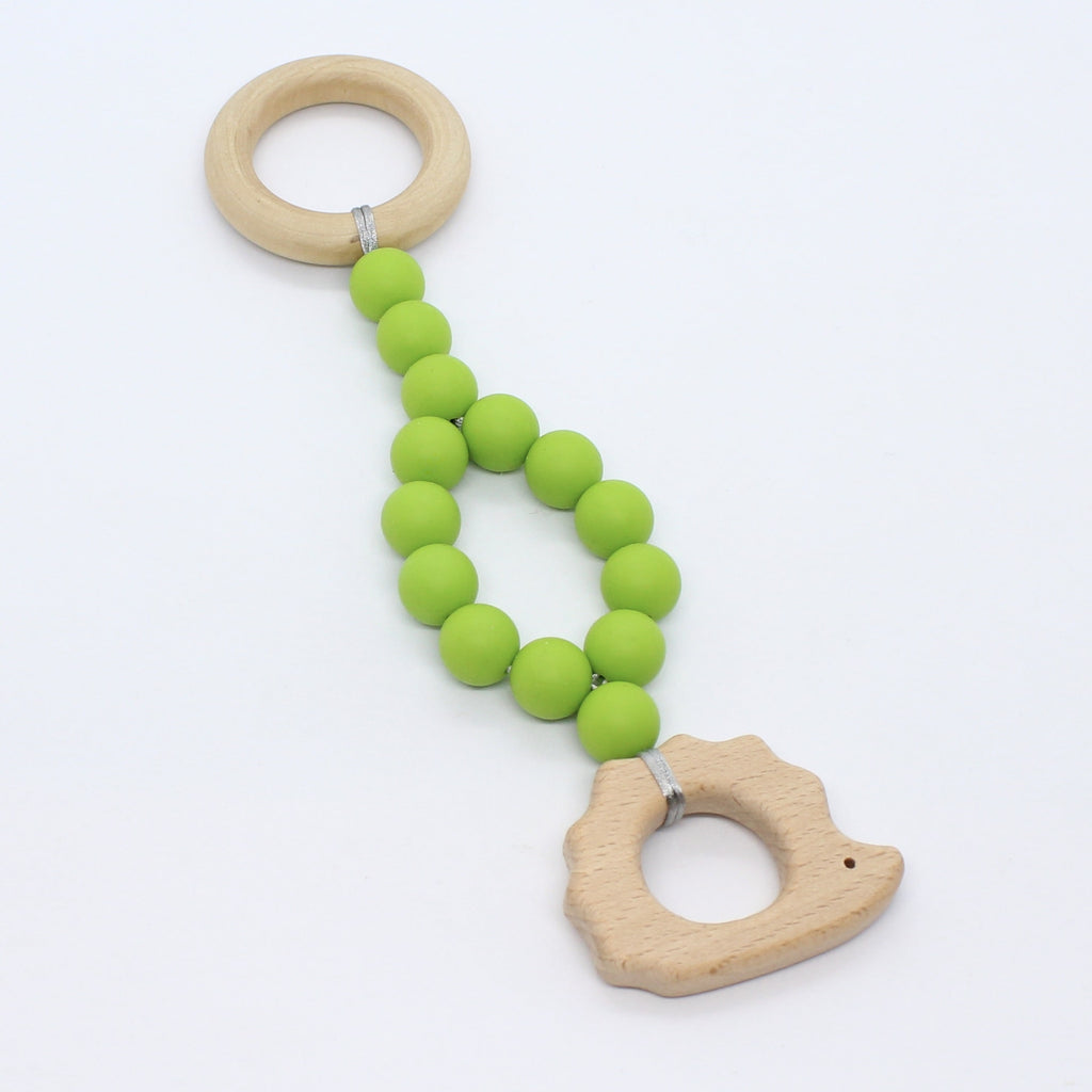 Lange of korte babygym uit hout en foodgrade silicone en met een mooi houten figuurtje.