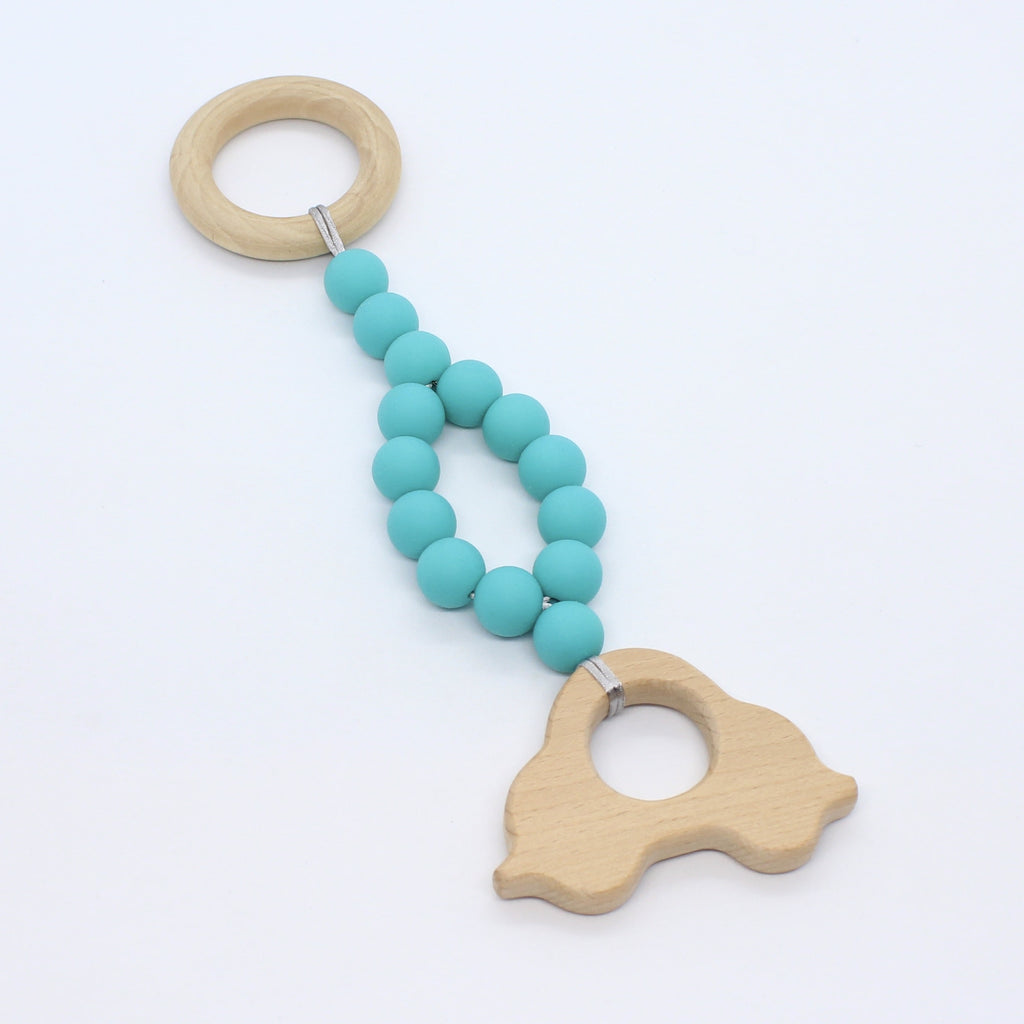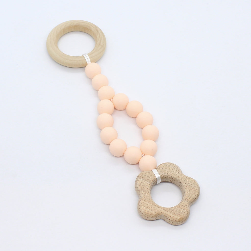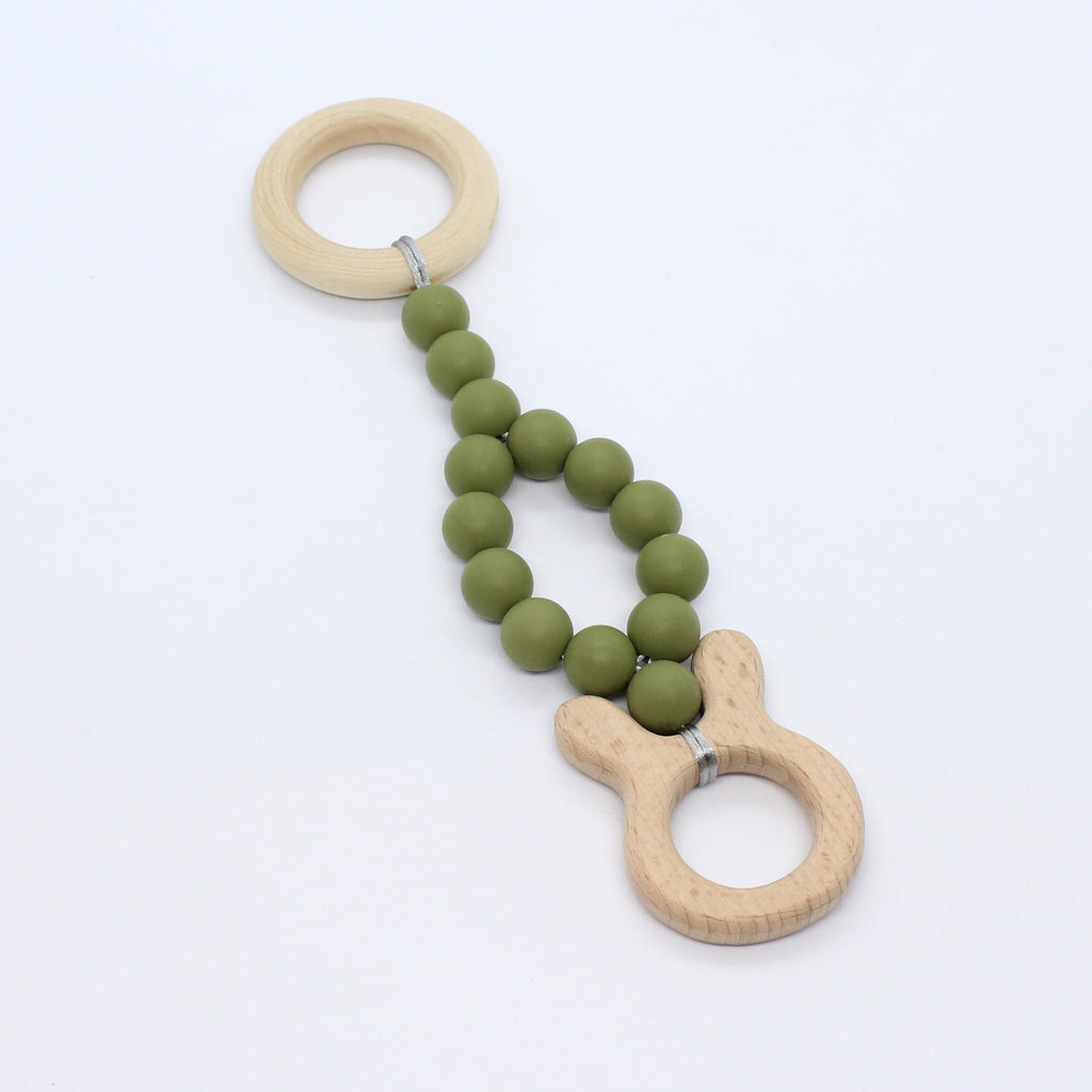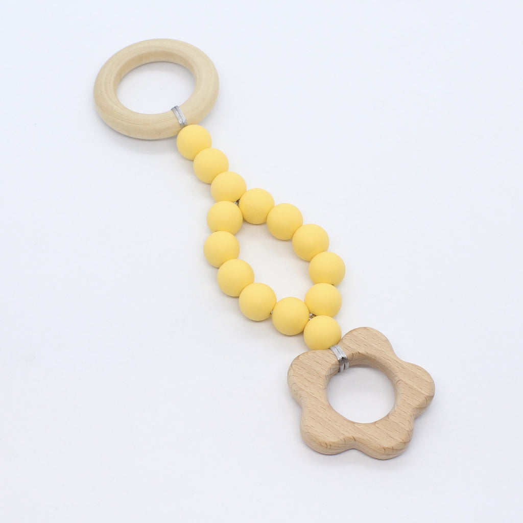 Lange of korte babygym uit hout en foodgrade silicone en met een mooi houten figuurtje.