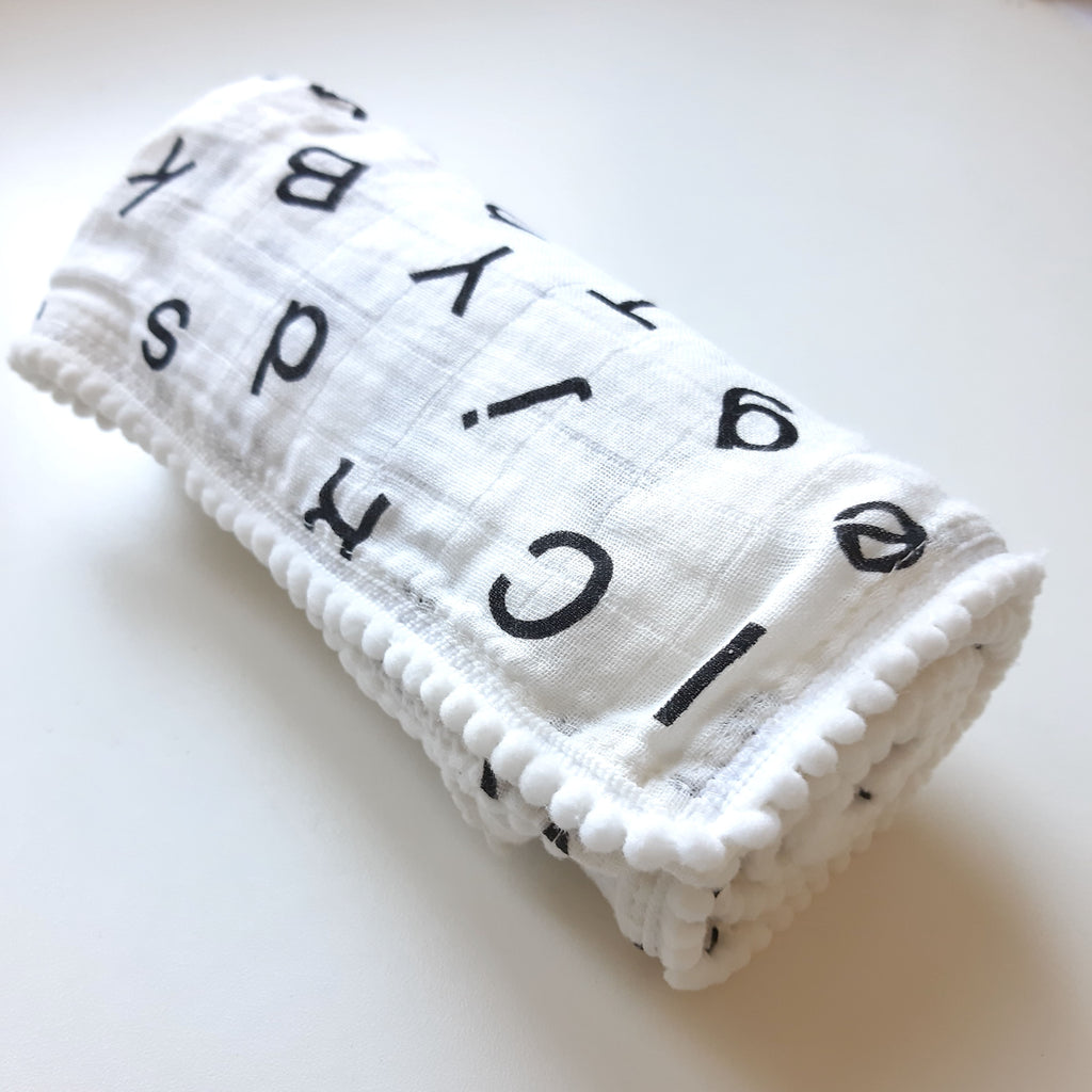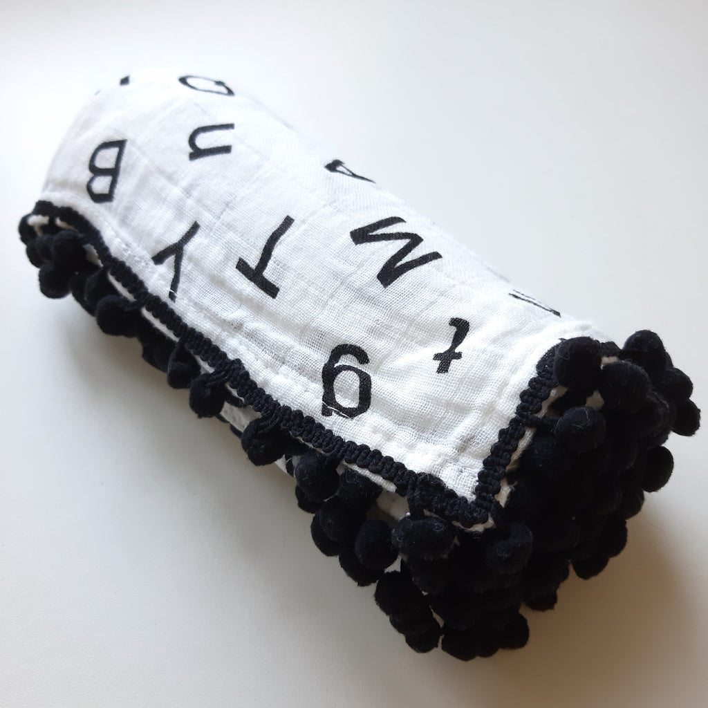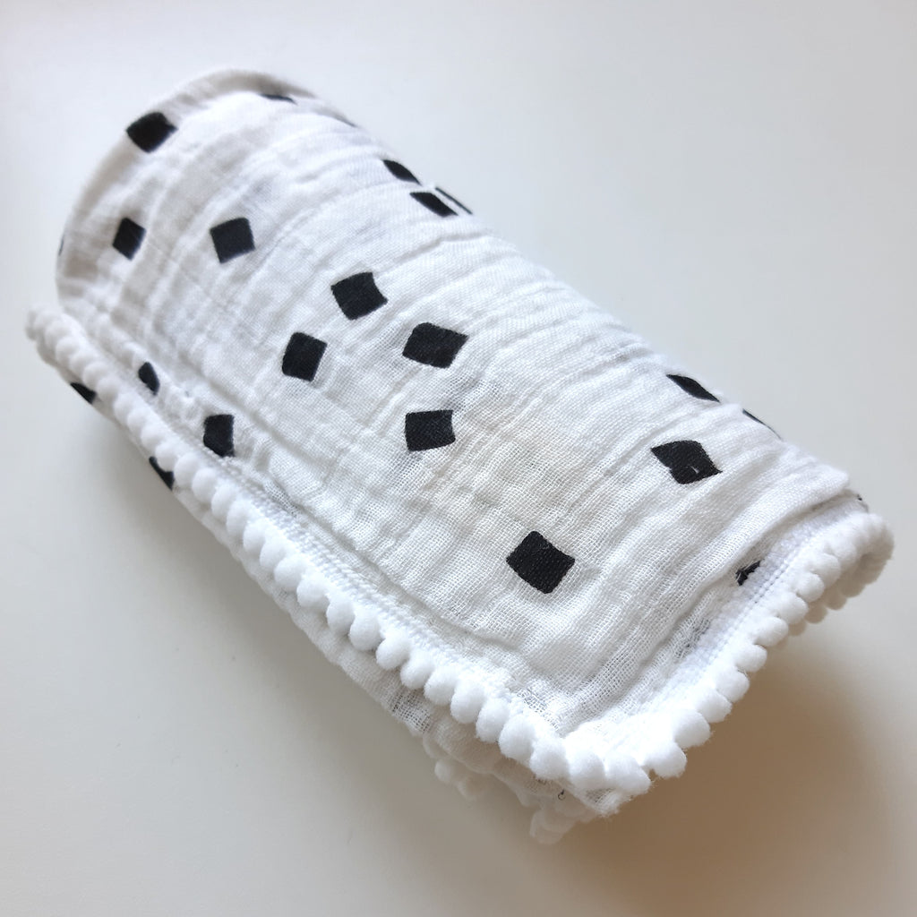 Onze doeken zijn een heerlijk groot formaat van ongeveer 110x110cm. Ze zijn afgewerkt met een vrolijke pomponband naar keuze.
